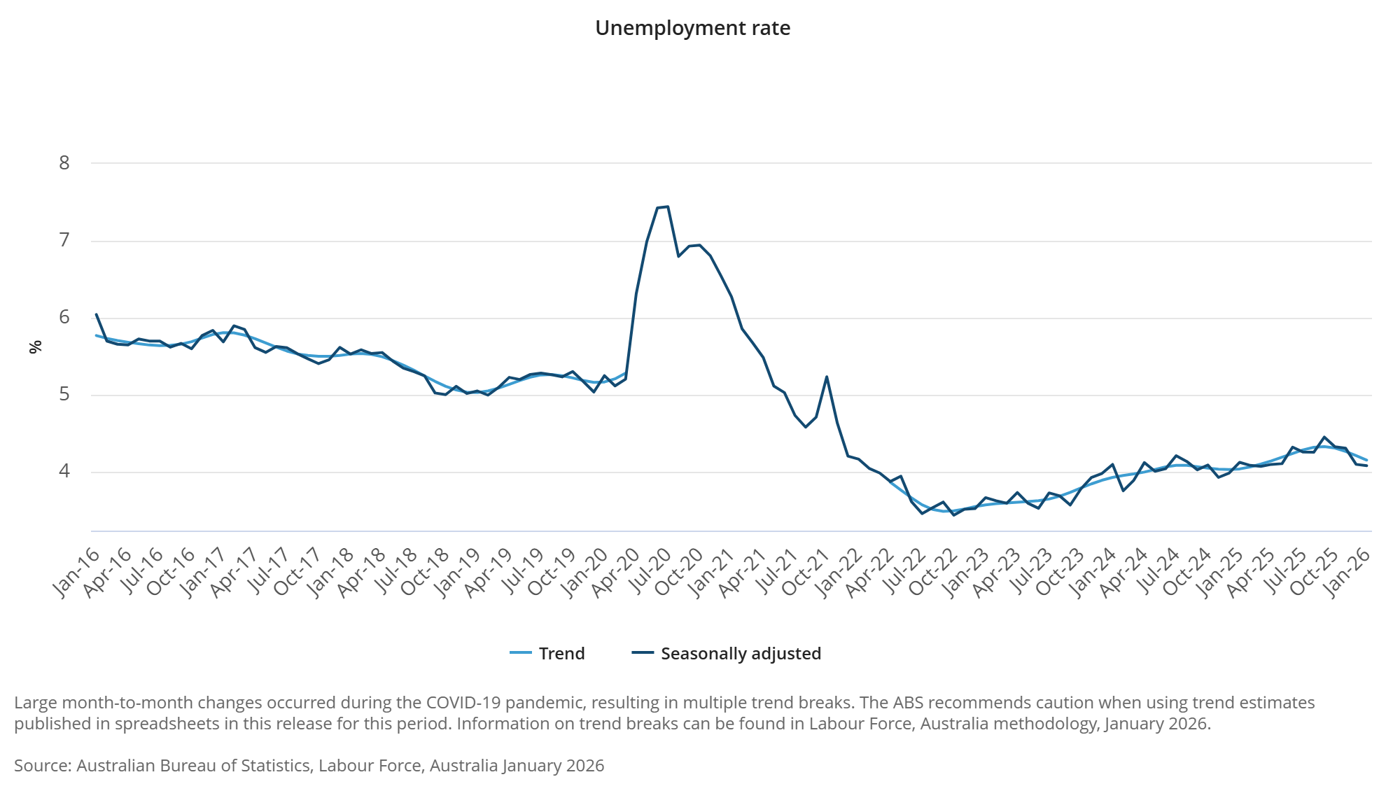 There was little change in ABS labour force figures for January, with seasonally adjusted unemployment remaining steady at 4.1% nationally (no movement in the participation rate).